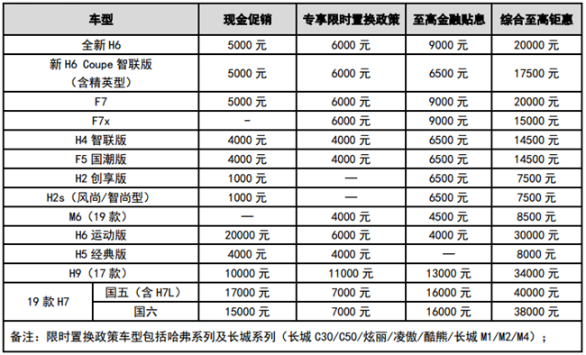 作为主力销售车型,在此次钜惠活动期间购买19款全新哈弗H6,可享受包含现金促销5000元,置换补贴至高6000元,金融贴息至高9000元在内的至高20,000元综合钜惠。19款全新哈弗H6新增哈弗Hi-Life车载系统,为本就具备高品质口碑的全新哈弗H6实力赋能。此外,对于选购哈弗H6运动版18款及国六的消费者而言,则至高可享受到现金促销20,000元,至高置换补贴6000元,金融贴息至高4000元的至高30,000元综合至高钜惠,实在是购车的绝佳时机。