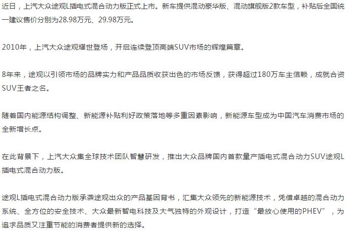 混然天成 大有可观 28.98万元-29.98万元 途观L插电式混合动力版澎湃上市